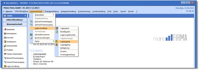 1. Zeigen Sie mit der Maus im Hauptmenü auf "Warenwirtschaft > Lagerverwaltung > Lagerzugang".