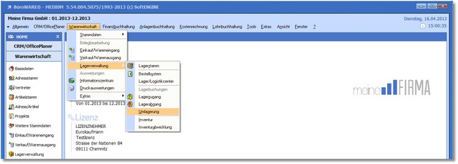 1. Zeigen Sie mit der Maus im Hauptmenü auf "Warenwirtschaft > Lagerverwaltung > Umlagerung".