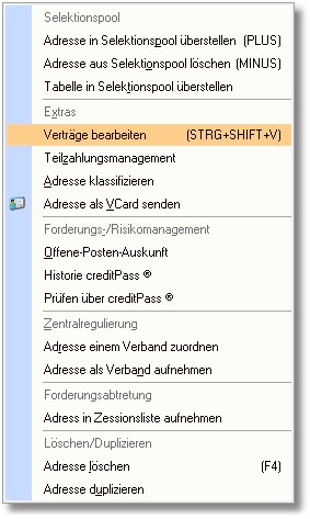 wechseln Sie mit [RETURN] in die Adressbearbeitung und wählen Sie dort den Menüpunkt "Bearbeiten > Verträge bearbeiten".