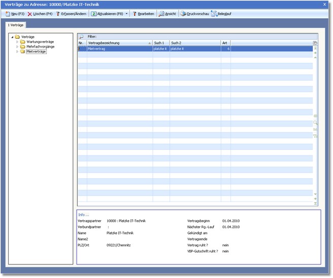 Das Programm öffnet die Vertragsverwaltung für die Platzke IT-Technik.