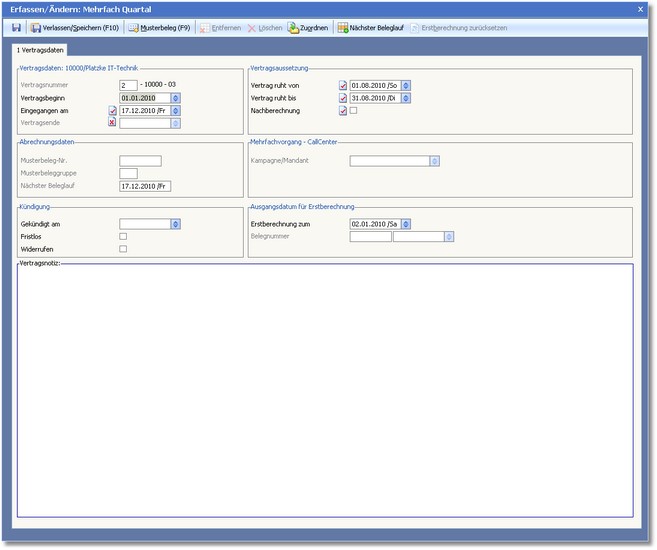 Mit der Funktionstaste [F10] schließen Sie den Dialog und speichern Ihre Eingaben. Das Programm kehrt zur vorgelagerten Auswahltabelle des Vertragscenters zurück.