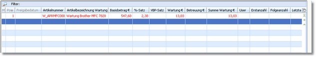 In dieser Tabelle erfassen Sie die Wartungs- bzw. Mietpositionen, die regelmäßig dem Kunden in Rechnung gestellt werden sollen. Hierfür werden spezielle "Wartungs- bzw. Mietartikel" verwendet, die Sie jeweils im Artikelstamm beim zutreffenden Artikel hinterlegen können (siehe: