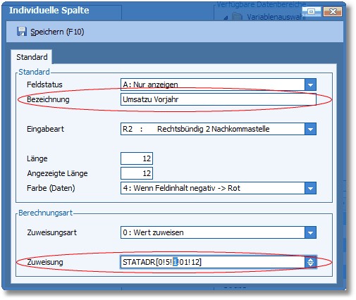 Hier wurde von STATADR[0!5!0!01!12], was ja zuvor schon die Variable für den aktuellen Umsatz war, nun auf STATADR[0!5!1!01!12] für die Variable des Umsatzes vom letzten Jahr, geändert.