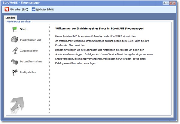 Wenn noch kein Marketplace angelegt wurde, wird nun der Shopmanager-Einrichtungsassistent geöffnet, der Sie durch die einzelnen Installationsschritte geleitet.