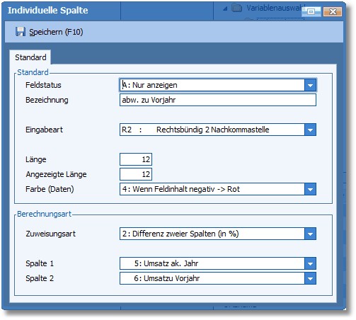 Es öffnet sich dabei das gleiche Dialogfenster, wie im Abschnitt "Eigenschaften ändern". Hier könnte z.B. eine Spalte eingefügt werden, die eine prozentuelle Differenz zwischen dem aktuellem und dem Vorjahresumsatz zeigen soll.