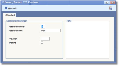 << Hier KLicken um eine Inhaltsübersicht anzuzeigen >> Navigation: BüroWARE Powerbridge > TEC-Kassenschnittstelle > Verwaltung TEC Kasse > Kassierer erfassen/ändern |