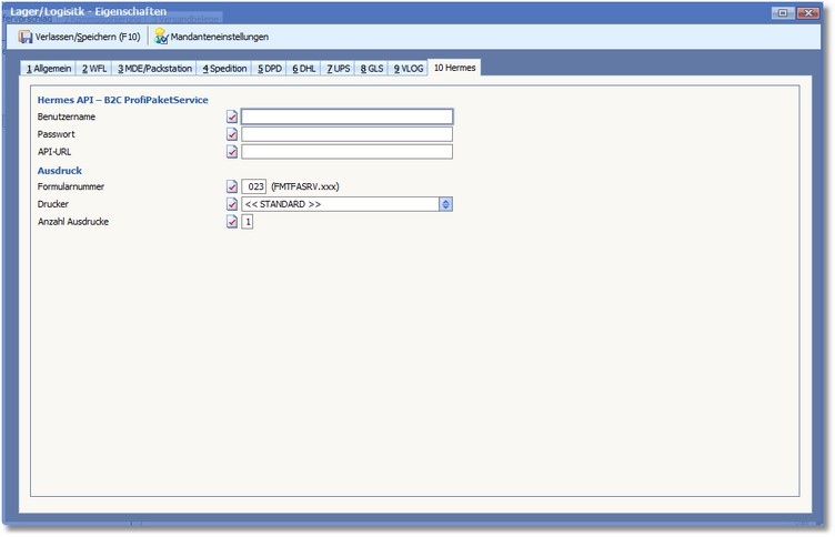 << Hier KLicken um eine Inhaltsübersicht anzuzeigen >> Navigation: Warenwirtschaft > Lagerverwaltung > Lager/Logistikcenter > Liefersystem - Eigenschaften > Die Karteikarte "Hermes" |