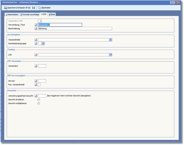 Firmenstamm Versandarten - Karteikarte 1, "Stammdaten"