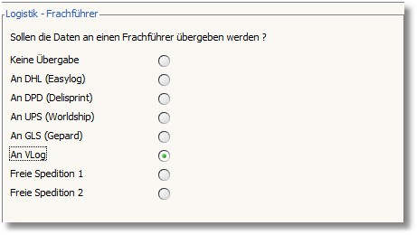 Geben Sie hier das Frachtführer Kürzel von VLog ein, mit welchem das Paket versendet werden soll.