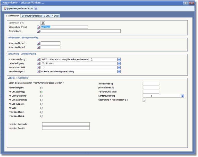 << Hier KLicken um eine Inhaltsübersicht anzuzeigen >> Navigation: Warenwirtschaft > Lagerverwaltung > Lager/Logistikcenter > Verpacken/Logistiker > Versandart |