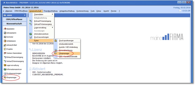 1. Klicken Sie mit der Maus im Hauptmenü auf "Warenwirtschaft > Extras > Shopmanager"
