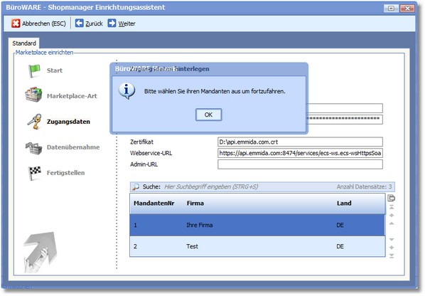 Wenn die Verbindung erfolgreich war, wird nun eine Mandantenauswahl aus emMida angezeigt.