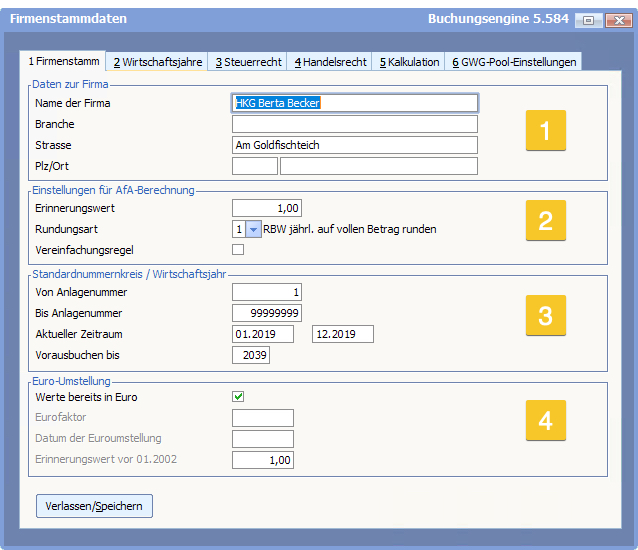 << Hier KLicken um eine Inhaltsübersicht anzuzeigen >> Navigation: Anlagenbuchhaltung > Stammdaten > Basisdaten > Die Karteikarte "Firmenstamm" |