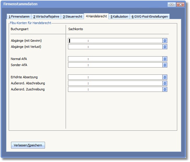 Diese Karteikarte nimmt die Konten auf, die für die Übergabe von handelsrechtlichen Buchungen an die Finanzbuchhaltung benötigt werden.