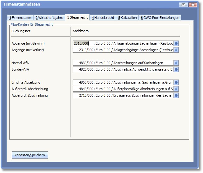 Tragen Sie hier das Konto ein, auf das die Abschreibungsbeträge der Anlagegegenstände fließen.