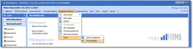1. Klicken Sie mit der Maus im Hauptmenü auf "Anlagenbuchhaltung > Extras > Fibu-Übergabe".