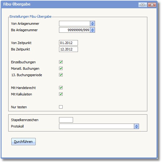 Hier können Sie einen Zeitraum in Form von Monat.Jahr [MM.JJJJ] angeben. Buchungen der Anlagenbuchhaltung, die in diesem Zeitraum liegen, werden an die Finanzbuchhaltung übergeben. Vergleichskriterium ist das AfA-Datum der einzelnen Anlagenbuchungen. Sie haben somit die Möglichkeit, die Buchungen in frei wählbaren Zeitfolgen an die Finanzbuchhaltung zu übertragen.