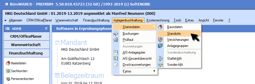 Öffnen Sie im Hauptmenü auf "Anlagenbuchhaltung > Stammdaten > Standorte".