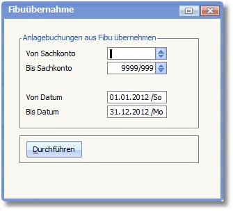 Mittels des Buttons <Übernahmelauf starten> öffnet sich ein weiterer Dialog, der es ermöglicht, die Buchungen auf Anlagegutkonten aus der Finanzbuchhaltung in die Tabelle einzulesen. Über folgende Felder können Sie bestimmen, welcher Buchungsbereich eingelesen werden soll.