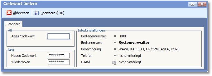 Im Designer über den Menüpunkt "Allgemein > Codewort ändern" haben Sie die Möglichkeit, das Codewort für den aktuell angemeldeten Bediener zu ändern:
