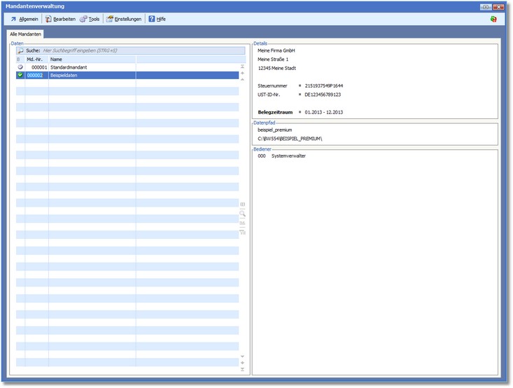 Das Programm öffnet eine Auswahltabelle mit allen bereits angelegten Mandanten.