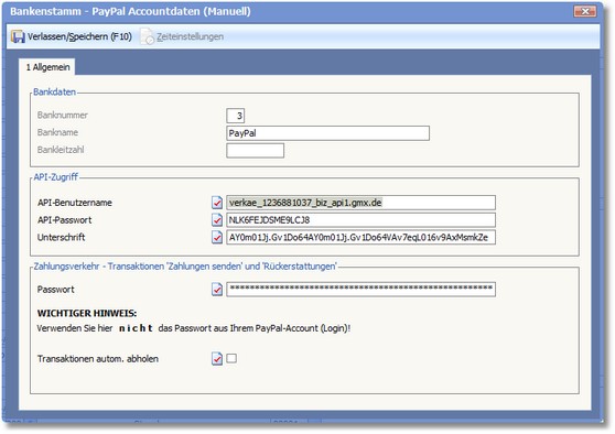 Hier ist ein freies Passwort für die manuelle Abholung der PayPal-Transaktionen zu hinterlegen.
