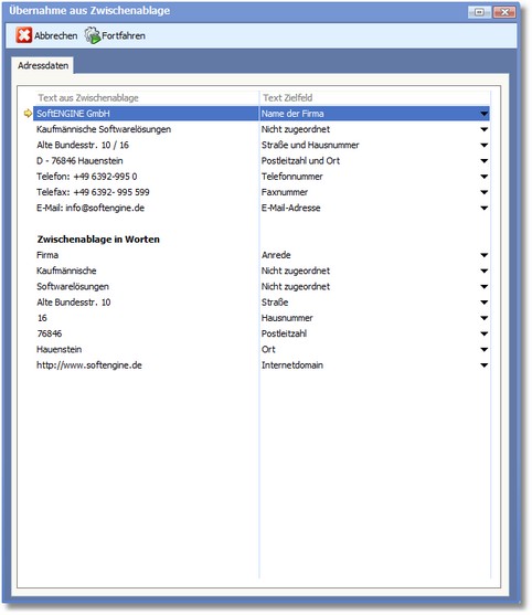 Diese Funktion ermöglicht die Übernahme von Adressen, die z.B. aus dem Impressum von Webseiten mit Hilfe der Zwischenablage in das Textfeld kopiert und in die entsprechenden Fenster eingelesen werden. Die Adresse kann so einfach und schnell als