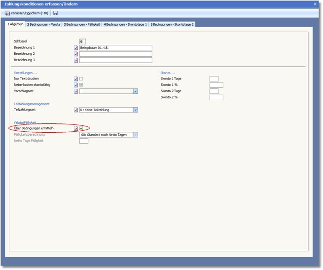 Wenn beim Bearbeiten einer Zahlungsbedingung in der Karteikarte "Allgemein" der Status des Feldes ÜBER BEDINGUNGEN ERMITTELN aktiviert þ und die Zahlungsbedingung gespeichert wurde, werden die Karteikarten 2-5 zur Eingabe frei geschaltet.