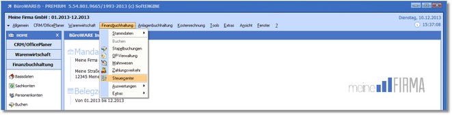 | 1. | Klicken Sie mit der Maus im Hauptmenü auf "Finanzbuchhaltung > Steuercenter". |