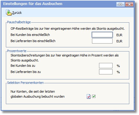 << Hier KLicken um eine Inhaltsübersicht anzuzeigen >> Navigation: Finanzbuchhaltung > Laufende Vorgänge > OP-Verwaltung > Funktionen vorheriger Versionen > Globale OP-Bearbeitung > Einstellungen für das für das Ausbuchen von OP-Restbeträgen |