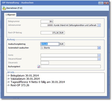 << Hier KLicken um eine Inhaltsübersicht anzuzeigen >> Navigation: Finanzbuchhaltung > Laufende Vorgänge > OP-Verwaltung > Karteikarte "Offene Posten" > OP ausbuchen |