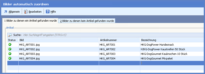 Wenn sehr viele Bilder den Artikeln zugeordnet werden müssen, kann eine automatische Zuordnung erfolgen. Voraussetzung dafür ist eine Abhängigkeit zwischen Datei und Artikel.