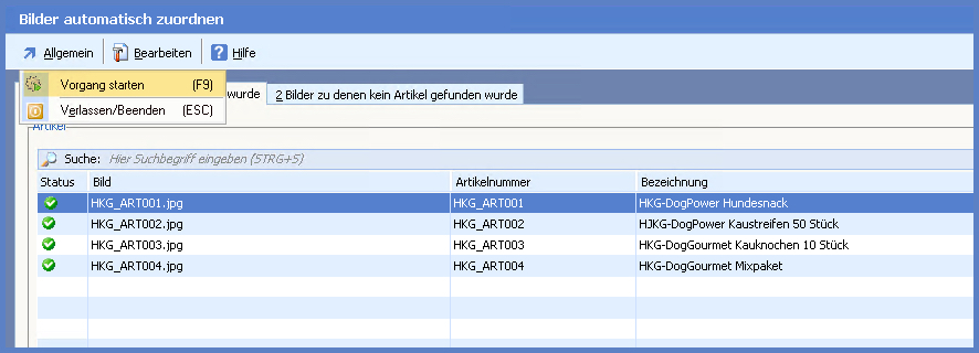 Die automatische Zuordnung starten Sie dann über das Menü „Allgemein“ mit „Vorgang starten“ oder mittels der Taste [F9].