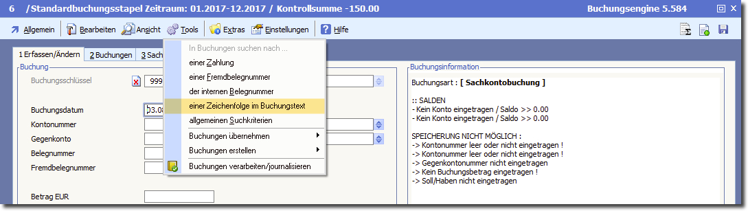 ➜ Zusätzlich steht Ihnen noch die Suche über das Menü "Tools" (erreichbar von Registerkarte 1 "Buchen") zur Verfügung.