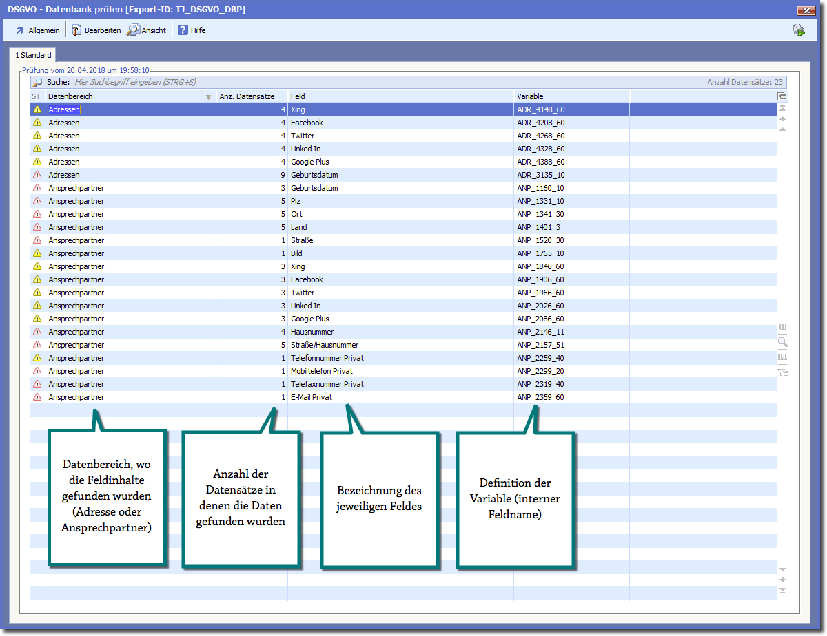 Beim Start dieser Funktion werden die als hinsichtlich der DSGVO kritisch bewerteten Felder auf Inhalt geprüft.