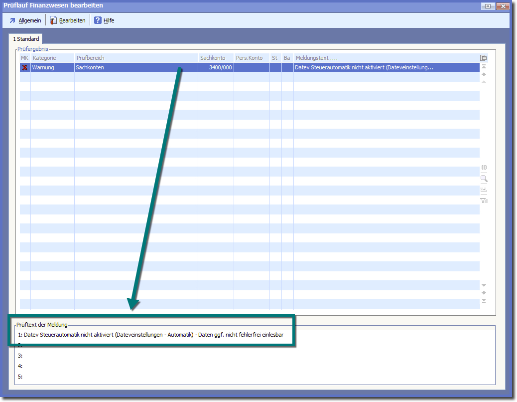 << Hier KLicken um eine Inhaltsübersicht anzuzeigen >> Navigation: Finanzbuchhaltung > Monatliche/periodische Arbeiten > Finanzbuchhaltung prüfen > Prüflauffehler und deren Bearbeitung > Fehler im DATEV-Prüflauf > DATEV Steuerautomatik nicht aktiviert |