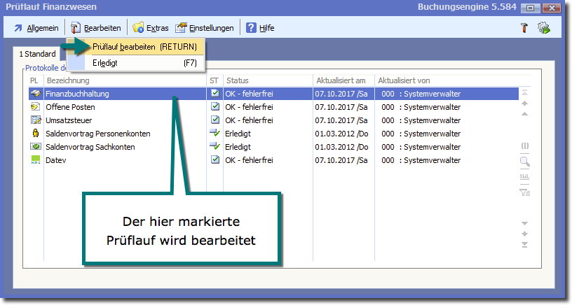Erledigt Werden Prüflauffehler ausgewiesen, kann der Prüflauf trotzdem manuell mit dem Status "Erledigt" versehen werden. Das beseitigt keine Fehler!