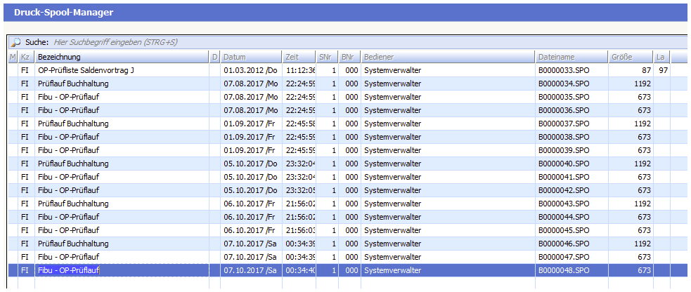 Druckarchiv (Spool) Öffnet den Druckspoolmanager. Hier finden Sie die Protokolle des Prüflaufs und können diese nochmals in Druckform anzeigen bzw. ausdrucken.
