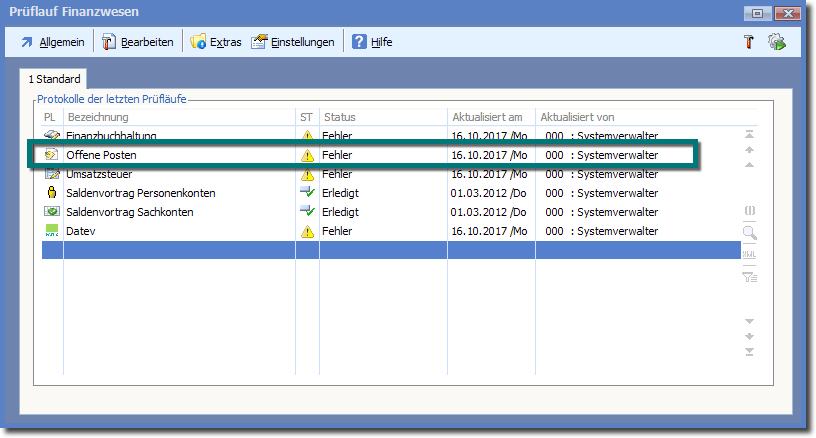 << Hier KLicken um eine Inhaltsübersicht anzuzeigen >> Navigation: Finanzbuchhaltung > Monatliche/periodische Arbeiten > Finanzbuchhaltung prüfen > Prüflauffehler und deren Bearbeitung > Fehler im OP-Prüflauf |
