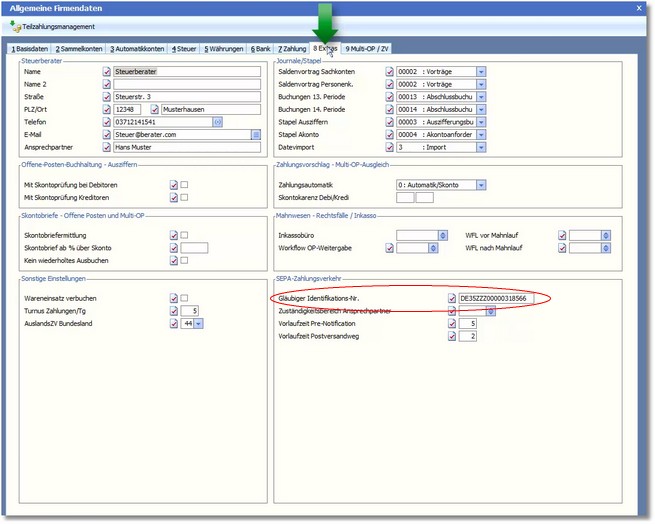 In der Karteikarte "Extras" des Firmenstamms muss die Gläubigeridentifikationsnummer eingetragen werden.