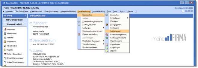 1. Klicken Sie mit der Maus im Hauptmenü auf "Kostenrechnung > Stammdaten > Leistungsarten".