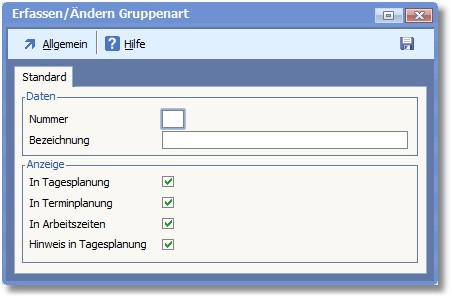 Geben Sie hier die Nummer der Gruppenart ein. Über diesen Schlüssel wird eine Arbeitsgruppe mit dieser Art verknüpft. Die Schlüssel 1-9 sind reserviert und können nicht vergeben werden.