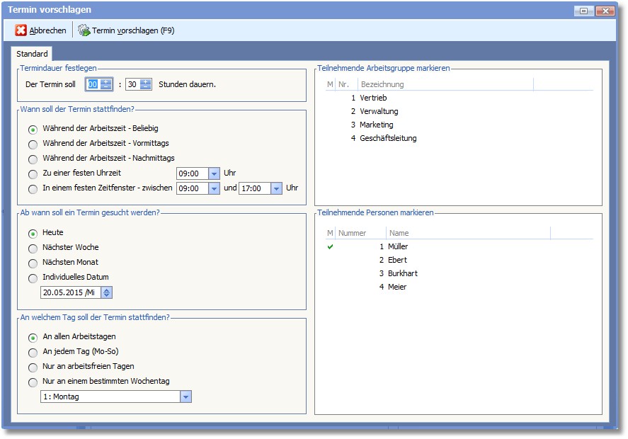 Mit [F9] wird nun ein Termin mit den hier festgelegten Einstellungen gesucht.