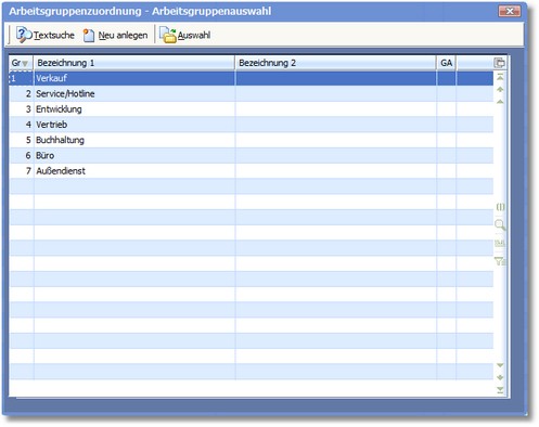 2. Wählen Sie die zutreffende Arbeitsgruppe aus und klicken Sie in der horizontalen Symbolleiste der Auswahltabelle „Arbeitsgruppen" auf den Button <Auswahl>.