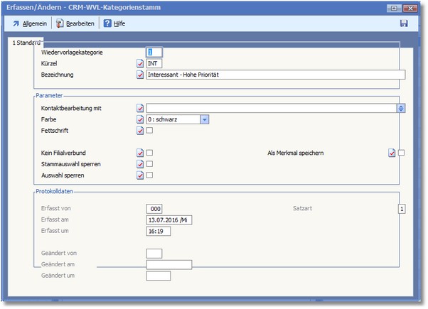 << Hier KLicken um eine Inhaltsübersicht anzuzeigen >> Navigation: CRM/OfficePlaner > Wiedervorlagen > Wiedervorlage - Menüleiste > CRM/Vertriebssteuerung > WVL-Kategorienstamm > WVL-Kategorien bearbeiten > Der Dialog "Erfassen/Ändern - CRM-WVL-Kategorienstamm" |