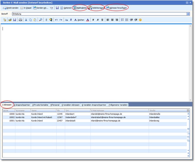 << Hier KLicken um eine Inhaltsübersicht anzuzeigen >> Navigation: CRM/OfficePlaner > Mailsystem > Mail einrichten > E-Mail-Assistent - Extras > Serien-E-Mails > Serienmails erfassen > Die Karteikarte "Adressen" |