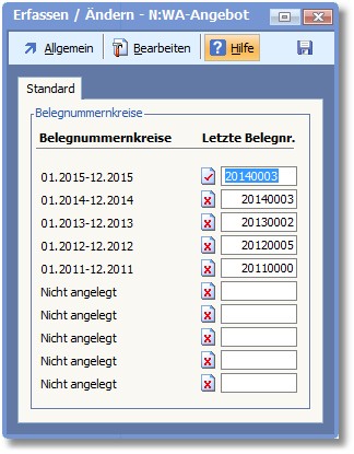 In dieser Karteikarte werden die Belegnummern zeitraumbezogen verwaltet. Die Fortschreibung der Belegnummern und die Einordnung der jeweils letzten Belegnummer in den entsprechenden Zeitraum wird vom Programm automatisch vorgenommen.