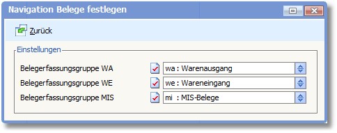 Hier können Sie eine vom Standard abweichende Navigationsstruktur eintragen, die das Programm in der zentralen Belegerfassung und im Beleg-MIS verwenden soll. Die [F5]-Taste öffnet die Auswahltabelle der Belegerfassungsgruppen.