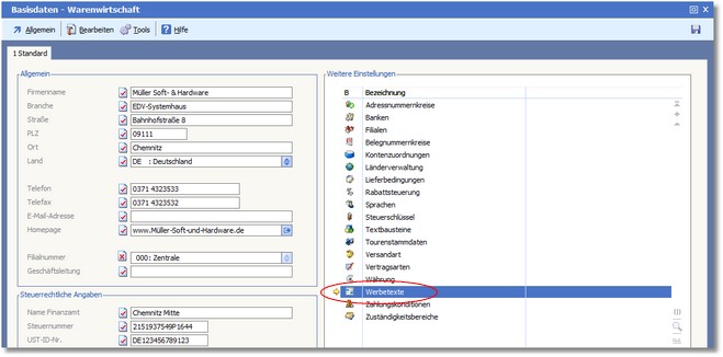 << Hier KLicken um eine Inhaltsübersicht anzuzeigen >> Navigation: Warenwirtschaft > Stammdaten > Basisdaten > Werbetexte |