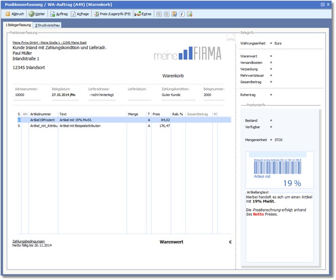 << Hier KLicken um eine Inhaltsübersicht anzuzeigen >> Navigation: Warenwirtschaft > Belegbearbeitung > Warenkorb > Belegerfassung mit dem Warenkorb |